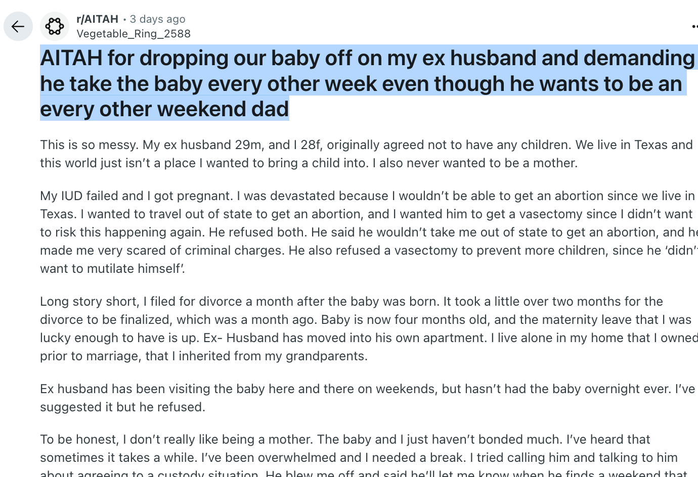 The Internet is abuzz about a rabid Reddit thread serves as a poignet vortex of the fallout of canceled reproductive rights and sexist parenting attitudes. While the equal parenting movement loves to bag on women, blaming them (us!) for being solely responsible for uninvolved fathers, in this case, the man is the AH and the internet rightfully supports …