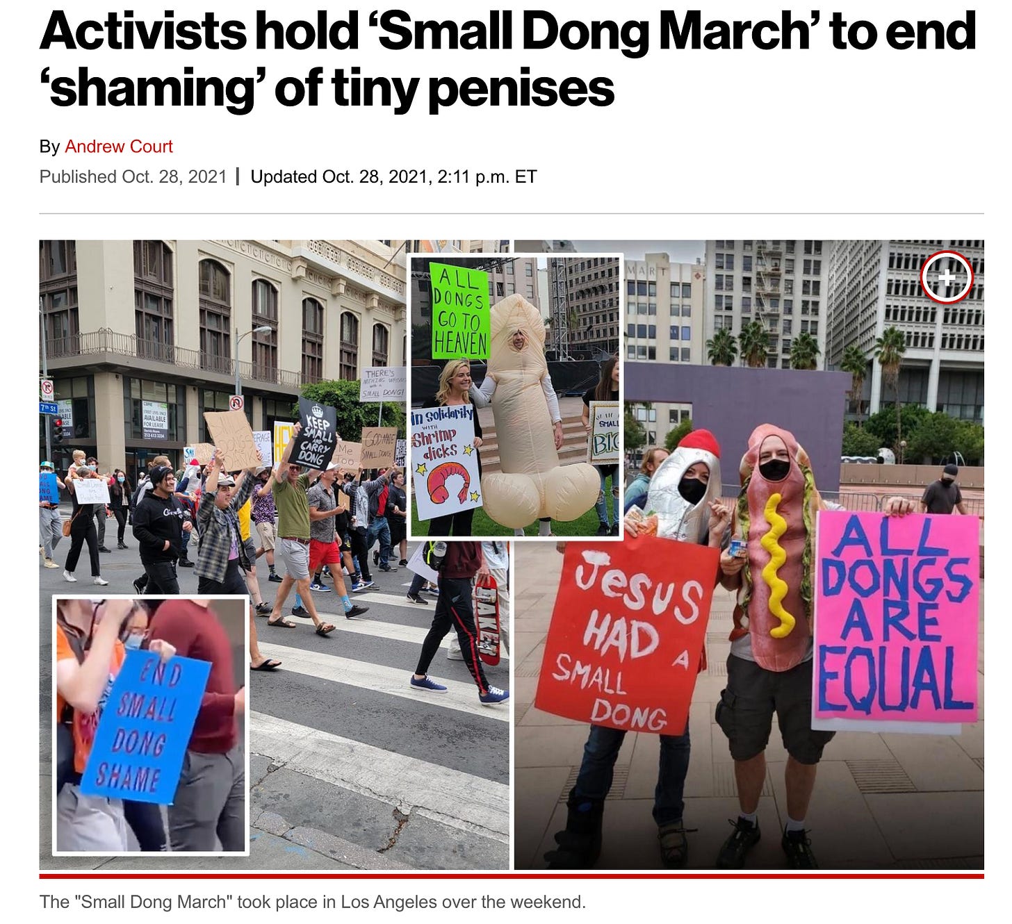 An exception: Comic duo Chad and JT a few years ago ironically-not-ironically pushed back on this shame-fest with a Small Dong March in Los Angeles, with signs featuring woke verbiage advocating for equality and allyship, solidarity and banning shame.