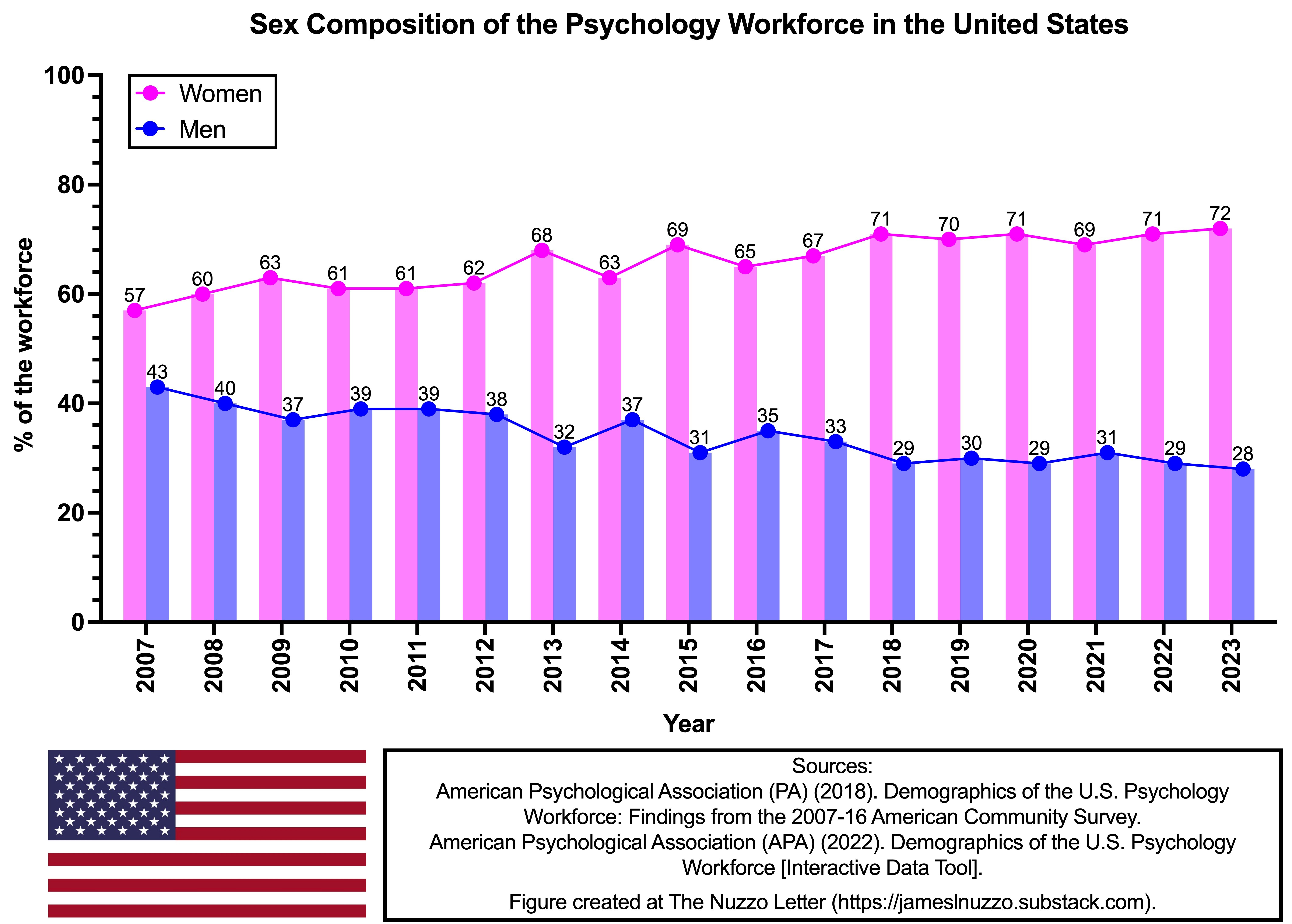 Over the 17-year period between 2007 and 2023, women’s representation in the psychology workforce in the U.S. increased by 15% in raw representation terms, whereas men’s representation decreased by 15% in raw representation terms.