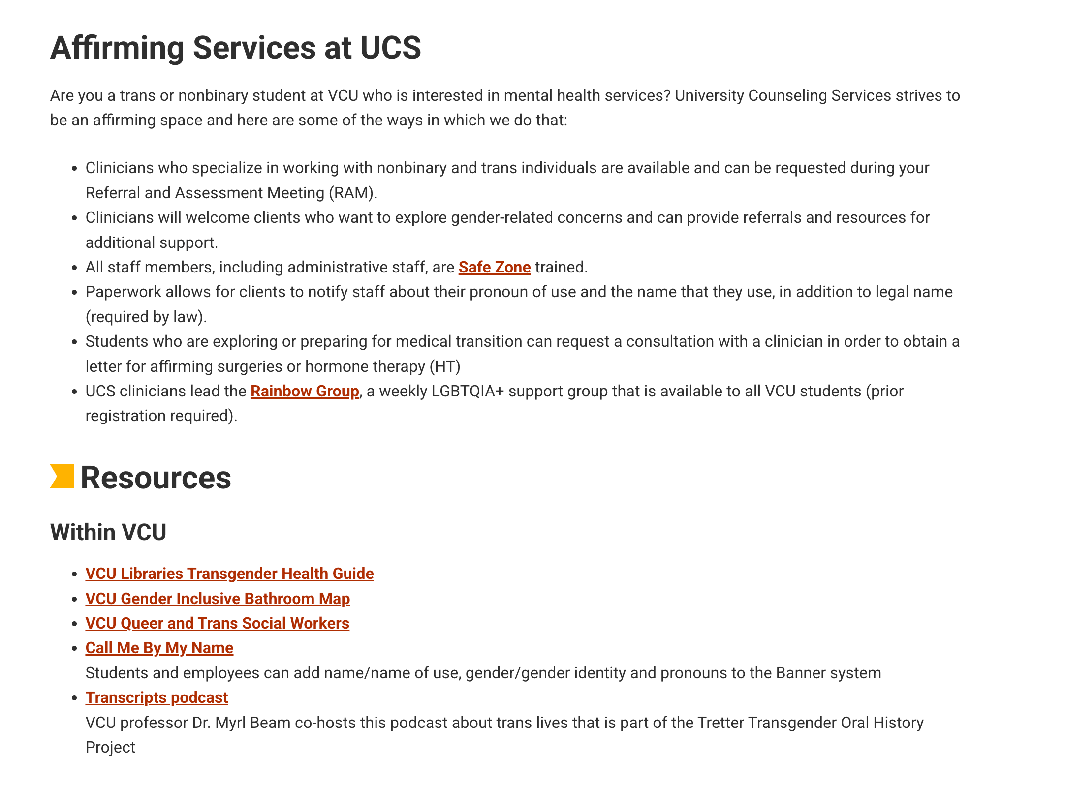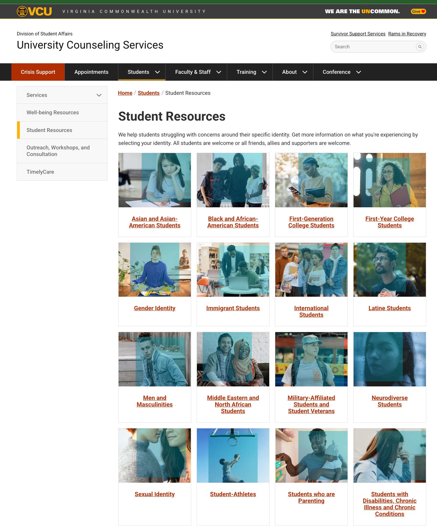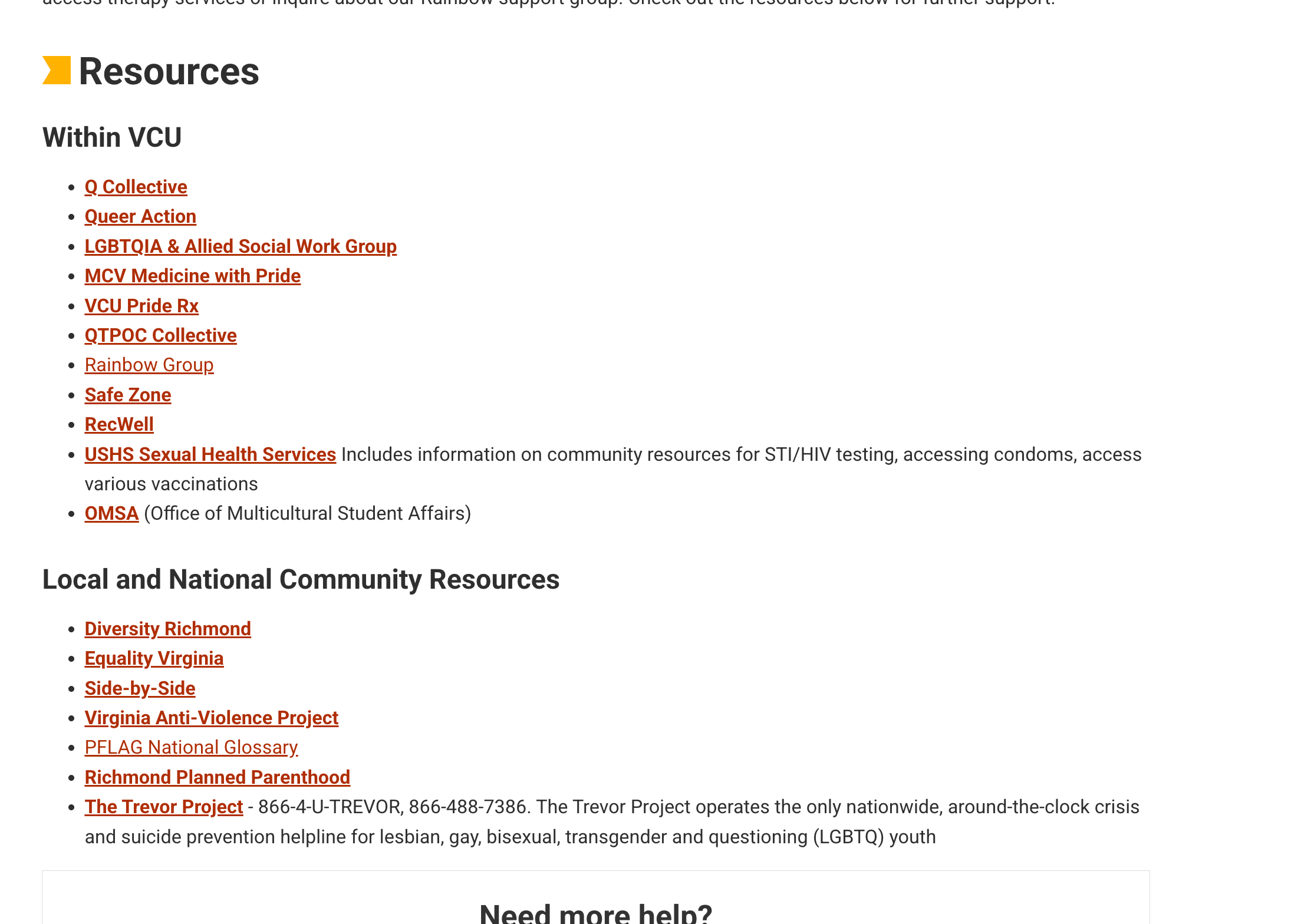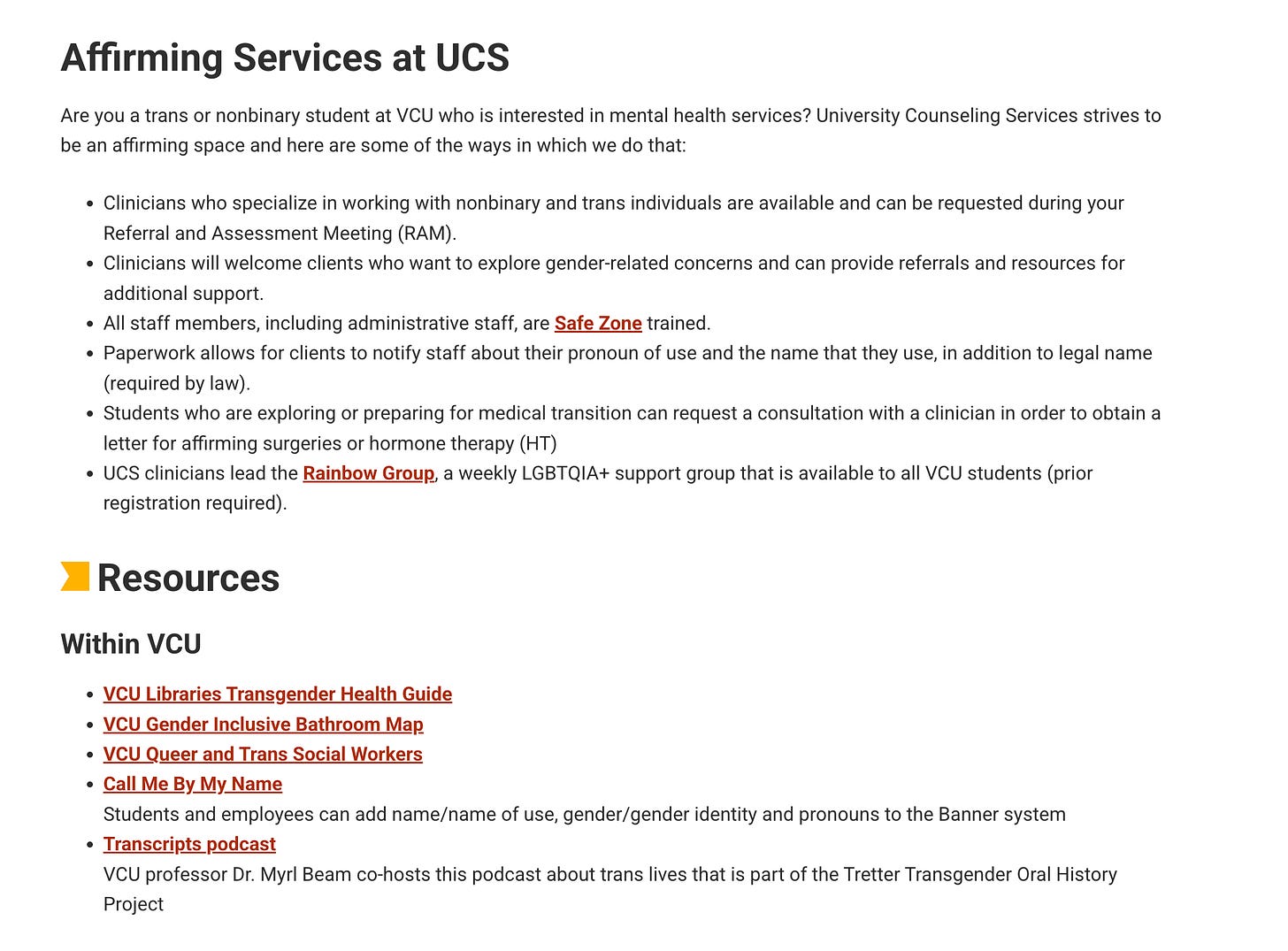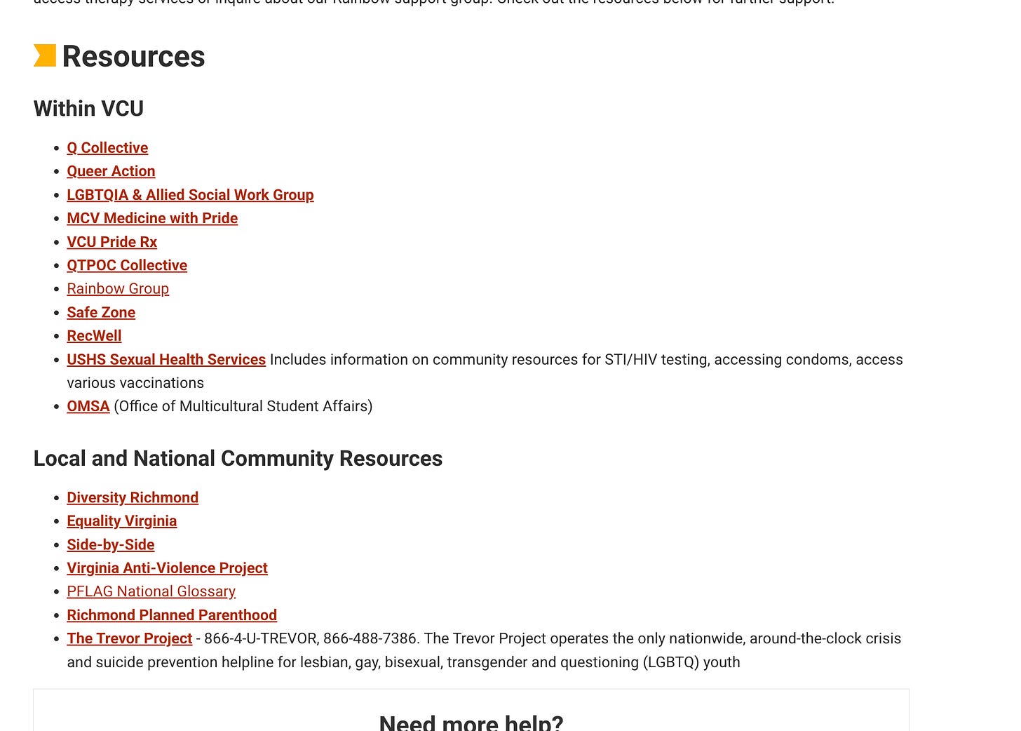 Each resource page lists services for struggling students who identify with that label. For example, under the Black and African American tab, VCU students will find counseling services specifically tailored to Black clients. Disabled students will find links to the school’s accessibility office and the campus Association of Students with Disabilities and Chronic Conditions Facebook group.