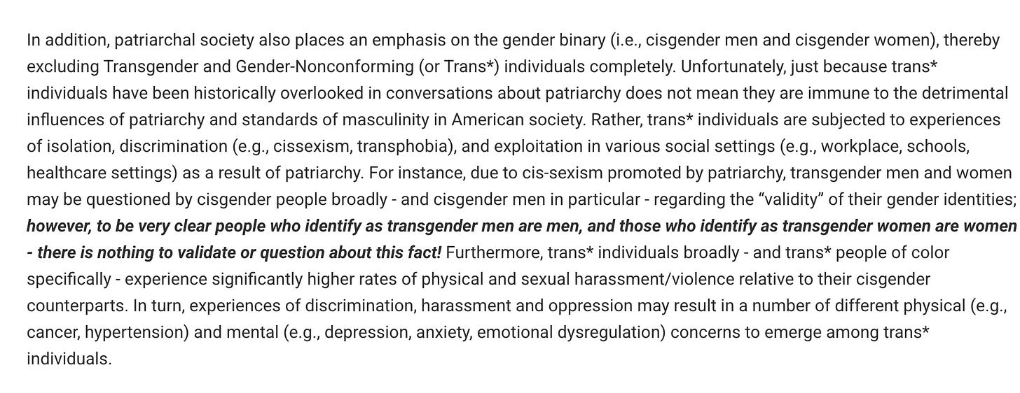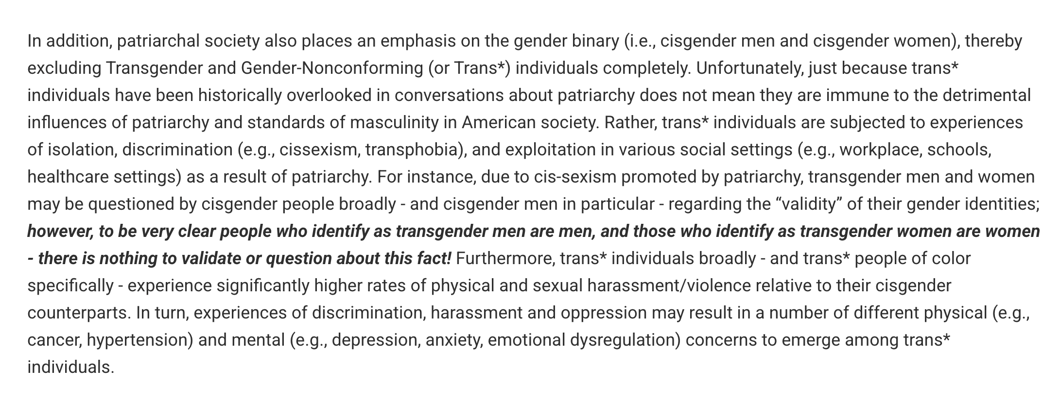 Those visiting the Men and Masculinities page get a long and winding explanation of gender ideology, traditional expectations of men, and the evils of patriarchy.